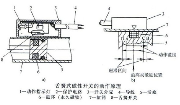 將舌簧開(kāi)關(guān)成型于合成樹(shù)脂塊內,帶有磁環(huán)的氣缸活塞向右運動(dòng)到A位置,舌簧開(kāi)關(guān)進(jìn)入磁場(chǎng)內,兩簧片被磁化而相互吸引,觸點(diǎn)閉合,發(fā)出一電信號;活塞運動(dòng)到B位置時(shí),舌簧開(kāi)關(guān)離開(kāi)磁場(chǎng),簧片失磁,觸點(diǎn)自動(dòng)脫開(kāi)。A-B區間稱(chēng)為磁性開(kāi)關(guān)的動(dòng)作范圍?;钊蜃蠓聪蜻\動(dòng)時(shí),動(dòng)作范圍是C-D區間。有觸點(diǎn)式磁性開(kāi)關(guān)的動(dòng)作范圍一般在5-14mm。B-C區間和D-A區間稱(chēng)為磁滯區間,此區間通常小于2mm??鄢艤^間的動(dòng)作范圍為最適合安裝位置,其中間位置稱(chēng)為最高靈敏度位置。若磁環(huán)停止在磁滯位置,則開(kāi)關(guān)動(dòng)作不穩定,易受外界干擾。