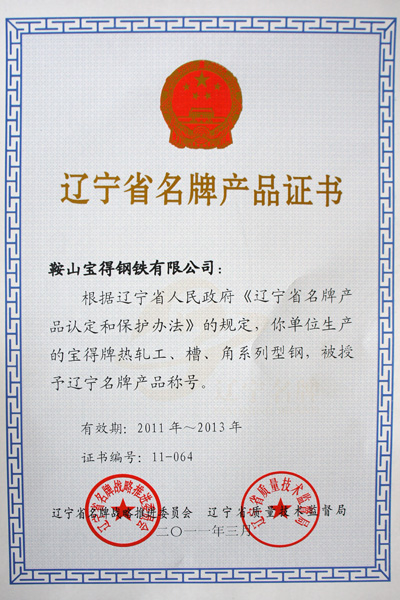 2011年3月,公司生產(chǎn)“寶得”牌熱軋工、槽、角系列型鋼,被遼寧省名牌戰略推進(jìn)委員會(huì )、遼寧省質(zhì)量技術(shù)監督局授予“遼寧省名牌產(chǎn)品”稱(chēng)號。